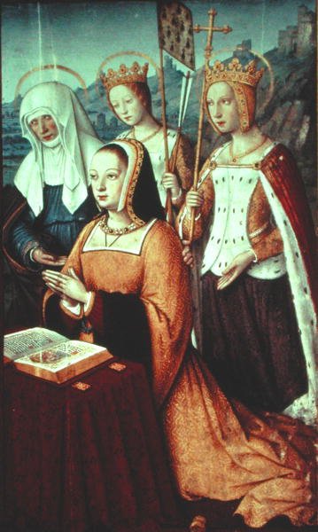 Title: Ms lat 9474 f.3v Anne of Brittany with St. Anne, St. Ursula and St. Helen, miniature from the Grandes Heures of Anne of Brittany, c.1503-8